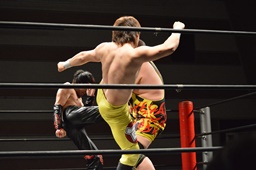 石川ロープに振る、FUMA切り返してジャンピングハイキック(右写真)、イサミにタッチ。