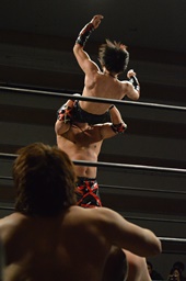 イサミコーナーに上ってダイビングダブルニードロップ(左写真)、宮本がカウント阻止。