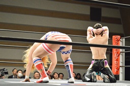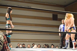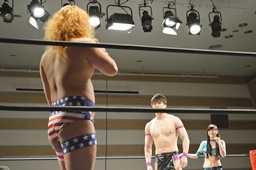 福田切り返してヘッドロックからフライングメイヤー(左写真)、円華ヘッドシザーズ。