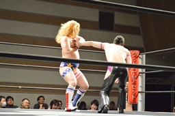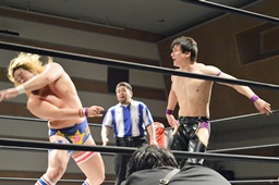 立花張り手(左写真)、円華首固め、カウント3。
