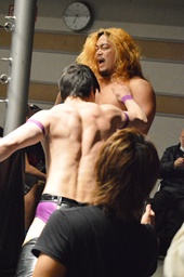 福田が割って入る(右写真)。「円華さん!僕はあなたに憧れてこの業界に入ったんですよ、立花さん!僕は忘れもしない、今から12、3年前に初めて千葉駅からバスで5分くらい乗ったところにある旭町というところにある千葉Blue Fieldで、あなたのファイトを見たんです、立花さん!当時、あなたはよくわからないスーパーXというマスクマンでした。そのときのあなたのファイトが忘れられなくて僕はプロレスラーになったんです、立花さん!僕は肩を外して欠場し、復帰してからというもの、毎日厳しいトレーニングを積んでまいりました。例え全日本の話が完全に消滅しても、」