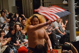 まず福田が星条旗を振り回しながら入場(右写真)。
