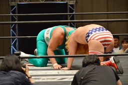 再度ロックアップ。ササダンゴがロープに詰め、ブレークするとチョップ(右写真)。福田「コンタクト取れた!」と場外エスケープ。