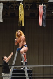 リングの上につるされたこのTシャツとかバギーパンツは一体何だ?(左写真)