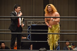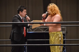 坂井良宏の代理人・川邊賢一郎弁護士がリングに(右写真)。承継される権利を読み上げる。「権利の部。@マッスル坂井のリングネーム使用権、グッズ販売権、プロレスリング活動に関わる一切の知的財産権、A坂井良宏の自宅建物の所有権。」
