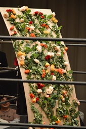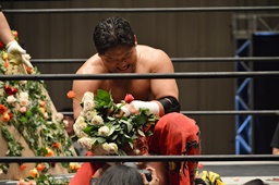 ロープに振って赤い薔薇の花束をフルスイング(左写真)。