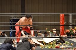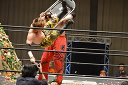 ヒザを着いた石川にソバット(右写真)、石川場外転落。