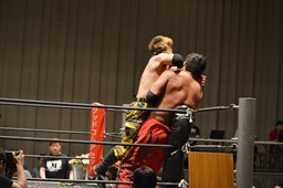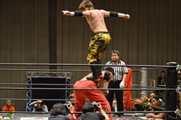 FUMAワキ固め狙う、石川ブロックして押しつぶし、コーナーに上ってダイビングフットスタンプ(右写真)。