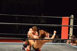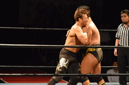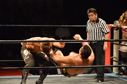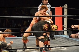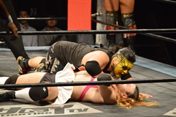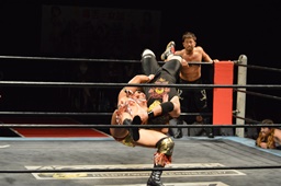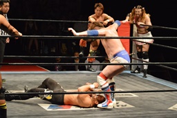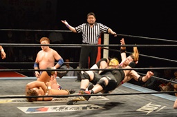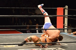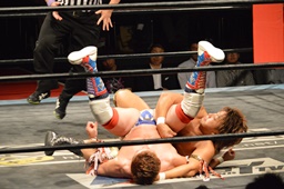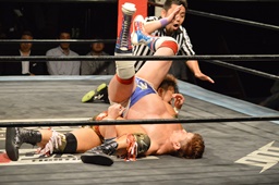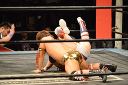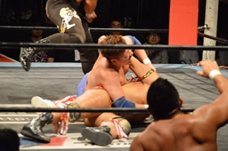 三富十字架固め(右写真)、カウント2。もう一度、しかしカウントは2。