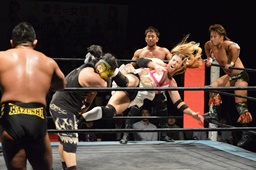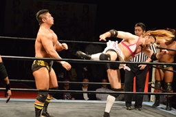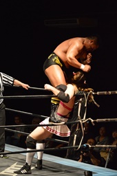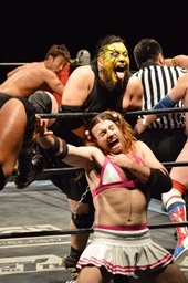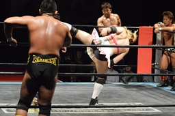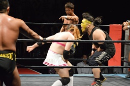 テイオーサミング、首投げからフェースカット(左写真)、諸橋の髪に攻撃。宮本にタッチ。