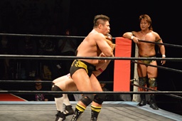 宮本もかみつき、コーナーでパンチ連打(左写真)、SAGATにタッチ。