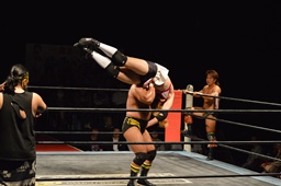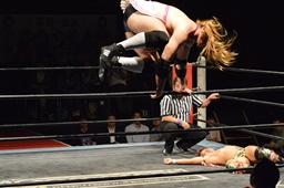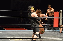 宮本も諸橋の髪をむしる。宮本ロープに振ってラリアット、諸橋かわしてジャーマン(右写真)、ビアちゃんにタッチ。
