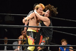 キングレギオンが退場後福田らユニオン勢がリングに飛び込んでくる(左写真)。