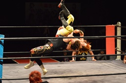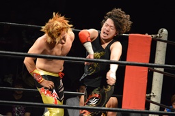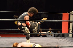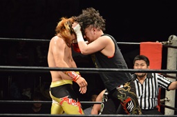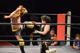コーナーに上ってダイビングヘッドバット(右写真)、カウント3。