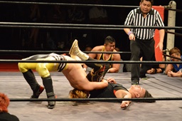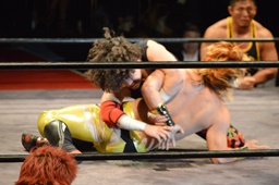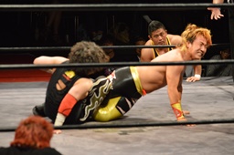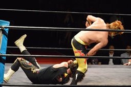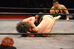 腕も取ってFUMAの両肩をつける(右写真)、カウント2。20分経過。