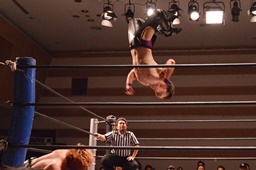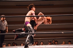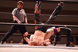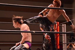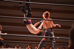 ジャンピングハイキック(左写真)、カウント2。