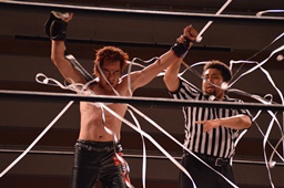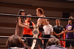 イサミ「円華さん、最高っす。やーなんか自分の中でも昔、KAIENTAI DOJOでデビューしたころとか実は一回だけシングルやっているけど、僕はあれはプロレスじゃないと思っている。米山興行でも一回ありましたけど時間切れで引き分けでした。僕は、このベルトを懸けて円華さんと試合するの夢だったんですよ。ありがとうございました。」(左写真)