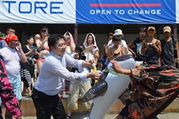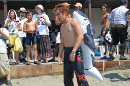 イサミ入場。やっぱり背中にはシャチ(右写真)。