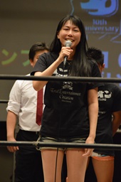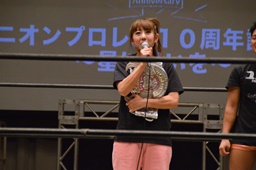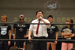 スーザン代表が笑顔で挨拶(左写真)。「本日はユニオン10周年記念、そして解散興行に本当にたくさんのご来場ありがとうございます。ユニオンプロレスは今日で解散いたしますが、この10年間、こうやってみんなとやってこれたのは本当にここに来てくださっている皆さんのおかげだと思っています。本当にありがとうございます。今日でユニオンプロレスは終わりますが、でも、ユニオンのみんなたちは今日からそれぞれに新しい道を歩き始めることになります。今日が終わりだけど、始まりなんです。約9年前に代表になった時は全然右も左も何もわからない状態で本当に頼りない代表だったと思います。今でも頼りあるか?と言ったらどうかわからないんですけど、それでもユニオンの選手とスタッフがついてきてくれて、そしてDDTとかDNAの子たちも協力してくれて、そしてここに来ているみんな、もしかしたら来れなかった人たちもたくさんいると思うけど、本当に温かく見守ってくれたおかげで、今まで代表を続けることができました。みんな本当にありがとうございました!」