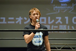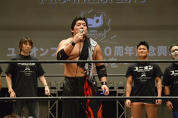 FUMA「ユニオンプロレス最後までご観戦ありがとうございました。ここで生まれ育ったユニオン戦士たちの応援を今後もよろしくお願いします。」(左写真)