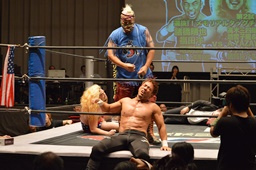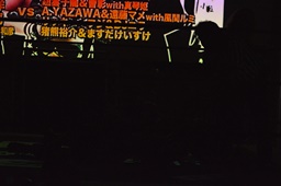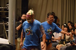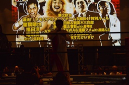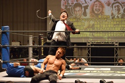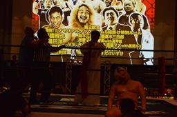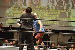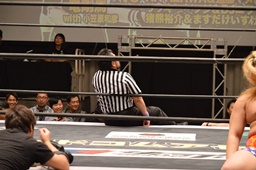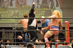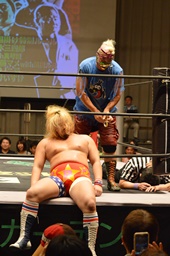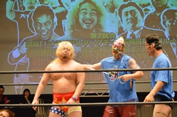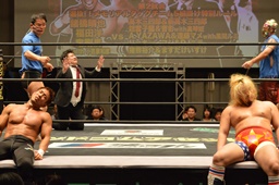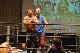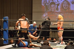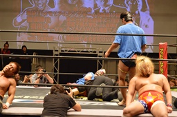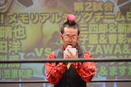 新藤リングアナから本日ようやくユニオン初登場の予定だった猪熊とますだが試合前のウォーミングアップの際に全治30年の怪我のため欠場となったこと、代わってガイジンA&ガイジンAが竜&福田と闘うことが発表される(左写真)。