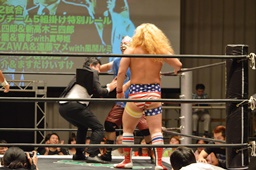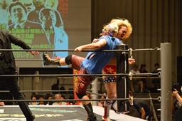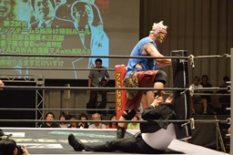 ガイジンAがコーナーから飛んでディープインパクト(左写真)、カウント2。