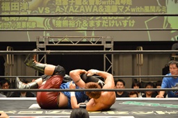 ガイジンAヘッドロックからフライングメイヤー、諸橋ヘッドシザーズ(左写真)でブレーク、竜にタッチ。
