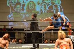 竜ではなく松井レフェリーに延髄蹴り(左写真)、松井レフェリーはダウン。伝説のムーヴが次から次に披露されるのを目の当たりにする快感。
