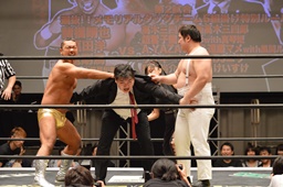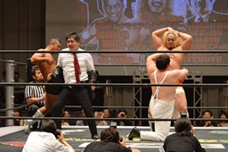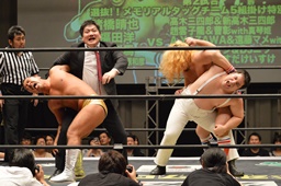 竜&福田組は形勢逆転、コブラツイストの競演(左写真)、