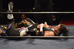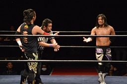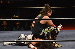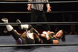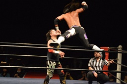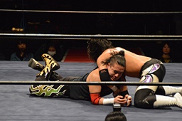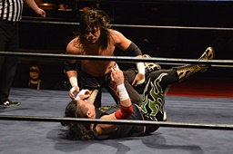 ドロップキック、腕固め(右写真)、佐々木ロープ。