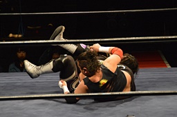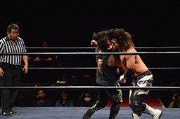 佐々木カニばさみで倒しヘッドロック、久保切り返してヘッドロック、佐々木ロープに振ると見せて久保の髪を引っ張る(右写真)。