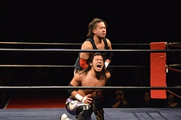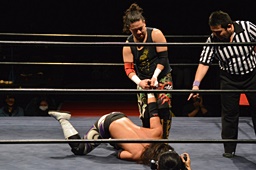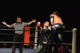 コーナーに上ってダイビングクローズライン(右写真)、カウント2。