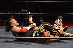 佐々木エビに丸め込む(左写真)、カウント2。