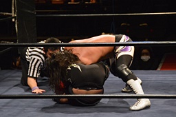 久保ロープに振る、佐々木は久保の股間をスライディング(左写真)、ロープに飛ぶ、