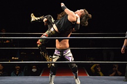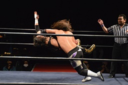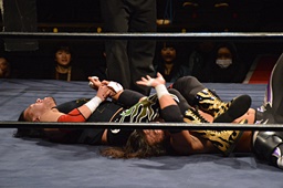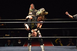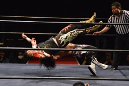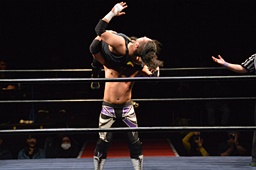 久保の後頭部にダイビングエルボードロップ(左写真)、カウント2。