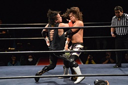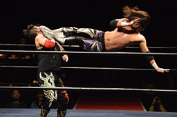 久保ロープに飛ぶ、佐々木カウンターのドロップキック(左写真)。