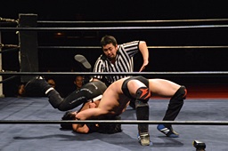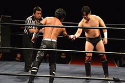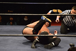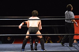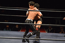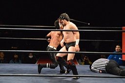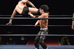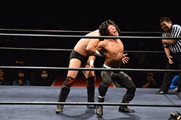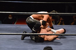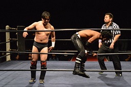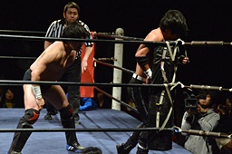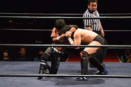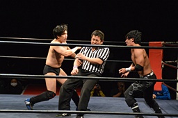丸山が突っ込む、佐藤トルネードクラッチ(左写真)、カウント2。