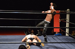 コーナーに上ってミサイルキック(左写真)、カウント2。