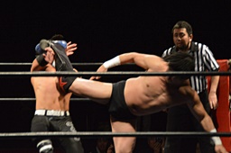 佐藤ネックブリーカー、顔面にドロップキック(右写真)。