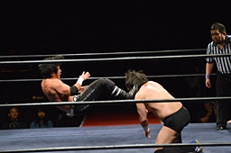 佐藤は丸山がドロップダウンに来るのを読んでキック(右写真)、ロープに飛ぶ、