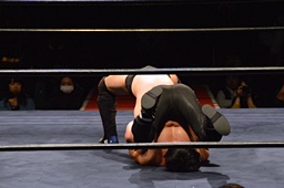 丸山がそのスキに攻撃を仕掛けるが佐藤はジャストフェースロックに(右写真)、丸山ロープ。