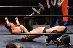 佐藤松井レフェリーの注意をそらして急所蹴り(右写真)、そしてジャーマン、ダブルダウン。