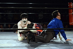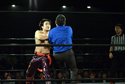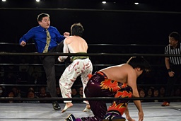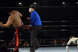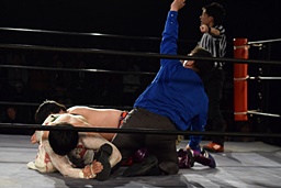 そのまま小仲は丸山を押さえ込むが、岡田レフェリーは丸山の股間に突っ込んでしまい(右写真)カウント入らず。4人がこの体勢のまま数十秒時間が止まる。5分経過。