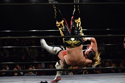 久保ロープに飛ぶ、Hi69キャッチしてみちのくドライバー(左写真)、カウント2。