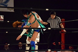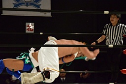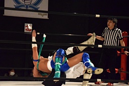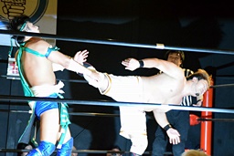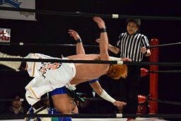 ロープに飛んでスライディングアックスボンバー(左写真)、カウント2。