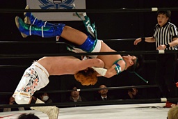 塚本投げっぱなしのタイガースープレックス(右写真)、