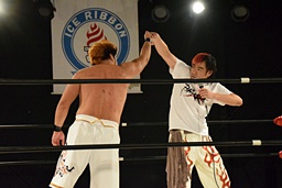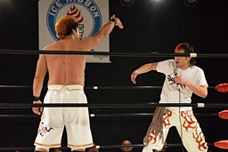 塚本「何も言い返すことはありません。でもBASARAは一人じゃ絶対無理なんで。それはお客さんの力もそうだし、選手・スタッフ全員の力を借りて。でもああいう気持ちがあるってことは僕もいい刺激になりました。っていうところでイサミさんいますか?」とイサミを呼び込む(右写真)。