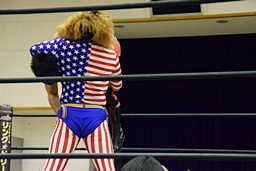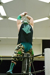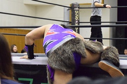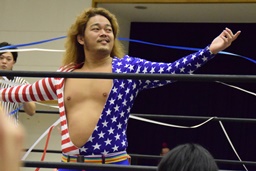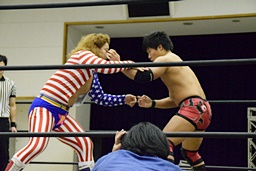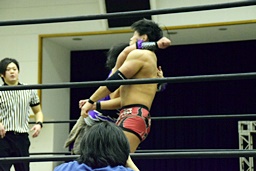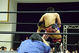 ロックアップ(右写真)、三原ヘッドロック、SAGATロープに振る、三原ショルダーブロック。SAGATは場外エスケープ。
