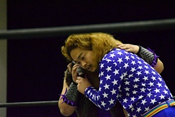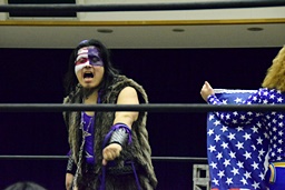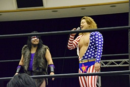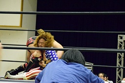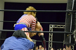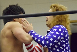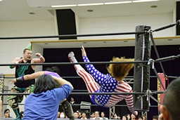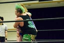 三原SAGATをロープに振ってマンハッタンドロップ、SAGATは首筋に噛みつく(左写真)。