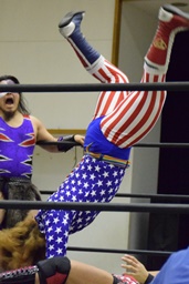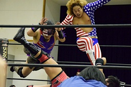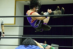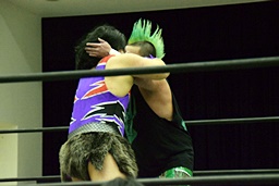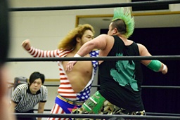 岩本パンチ、ロープに飛ぶ、福田は髪を引っ張って倒す(左写真)。福田バックドロップ狙う、岩本は孤高の芸術に切り返す。三原にタッチ。